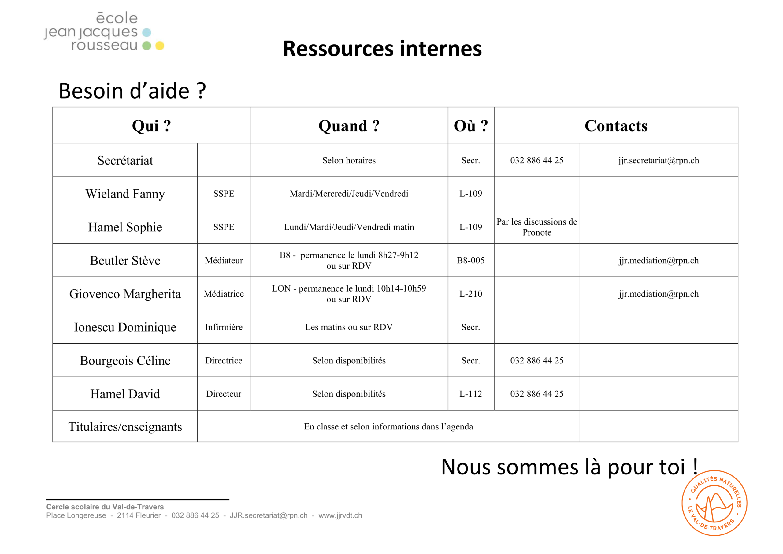 Tous les adultes de l’école sont à disposition et à mêmes d’accueillir les élèves ou leurs parents lorsqu’ils ont besoin de s’exprimer. Selon leur problème, ils seront redirigés vers les bons services et les personnes les plus à mêmes de les aider. Les ressources à contacter sont